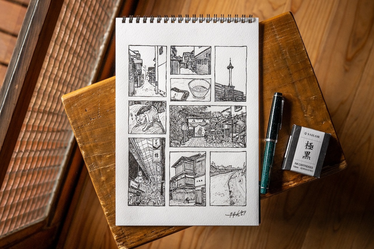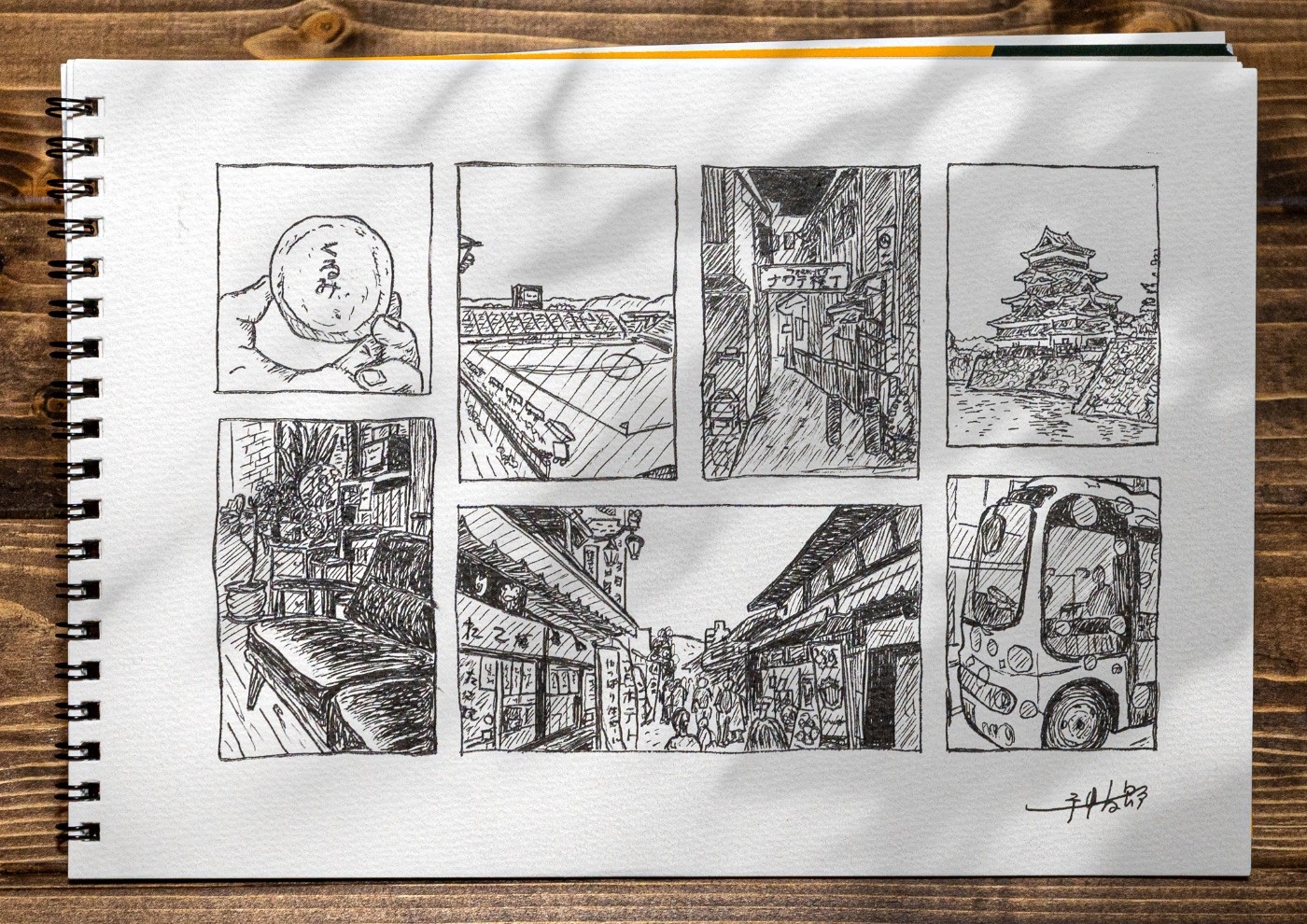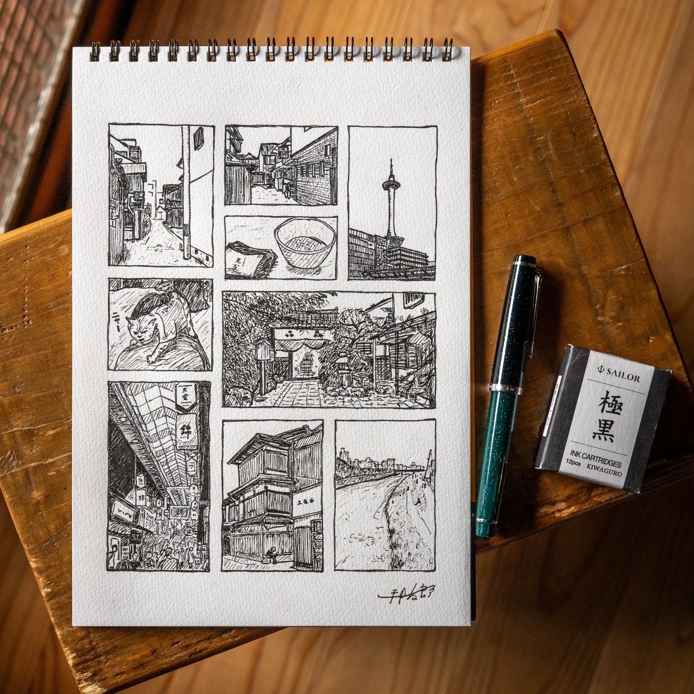 イチゴカメラ「Ep131 万年筆の書き味」以降、万年筆でイラストを描くことにハマる。描き散らかしている中でもこの記事では「旅の思い出」シリーズをまとめていく。「旅の思い出」シリーズは、スケッチブック1ページに、コマで割ったイラストを配置したものである。