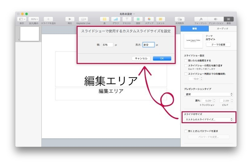 知らない人が多いですが、Keynoteはスライドのサイズを「4:3」、「16:9」だけでなく、任意のサイズに変更することができます。右上の「書類」ボタンをクリック、「スライドのサイズ」プルダウンメニューから「カスタムのスライドサイズ」を選択すると幅と高さを数値で入力できます。